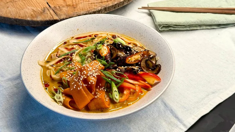 Vegetarisk ramen med udonnudlar och säsongens grönsaker