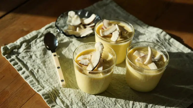En len och frisk dessert inspirerad av den klassiska indiska drycken mango lassi. Den krämiga panna cotta-smaken kombineras med söt mango och syrlig yoghurt, och toppas med krispiga kokoschips för extra textur. Låt stå i kylen i minst fyra timmar innan servering!