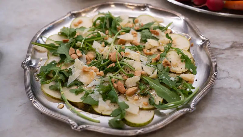 Fräscha päron i tunna skivor med parmesan, mandlar och honung – lätt, vackert och full av smak. Receptet räcker till 4 personer som förrätt eller buffé och är framtaget tillsammans med Emelie Johansson.