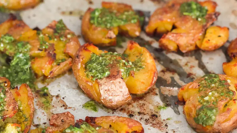 Krispiga smashed potatoes med chimichurri! Ett gott recept som passar bra till grillat kött, fisk och grönsaker. Vi ger vår chimichurri lite extra sting och ringlar över våra krispiga smashed potatoes.