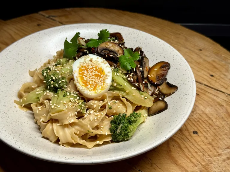 Knife cut nudlar med krämig sesam- & misosås