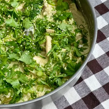 Krämig och matig kycklinggryta med grön curry och kokosmjölk. En smakrik och lättlagad rätt att laga till middagen och ha i matlådan