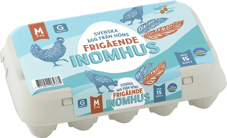 15-pack ägg från frigående höns inomhus. Mediumstora från Sverige.