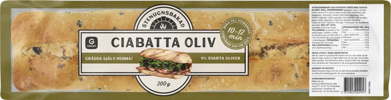 Stenugnsbakad ciabatta med svarta oliver. Halvgräddad, bakas klart på 10-12 minuter i ugnen och får då en mjuk och luftig insida och en lätt krispig yta. Passar lika bra till soppor och sallader som att fyllas med dina favoritingredienser. 300 gram.