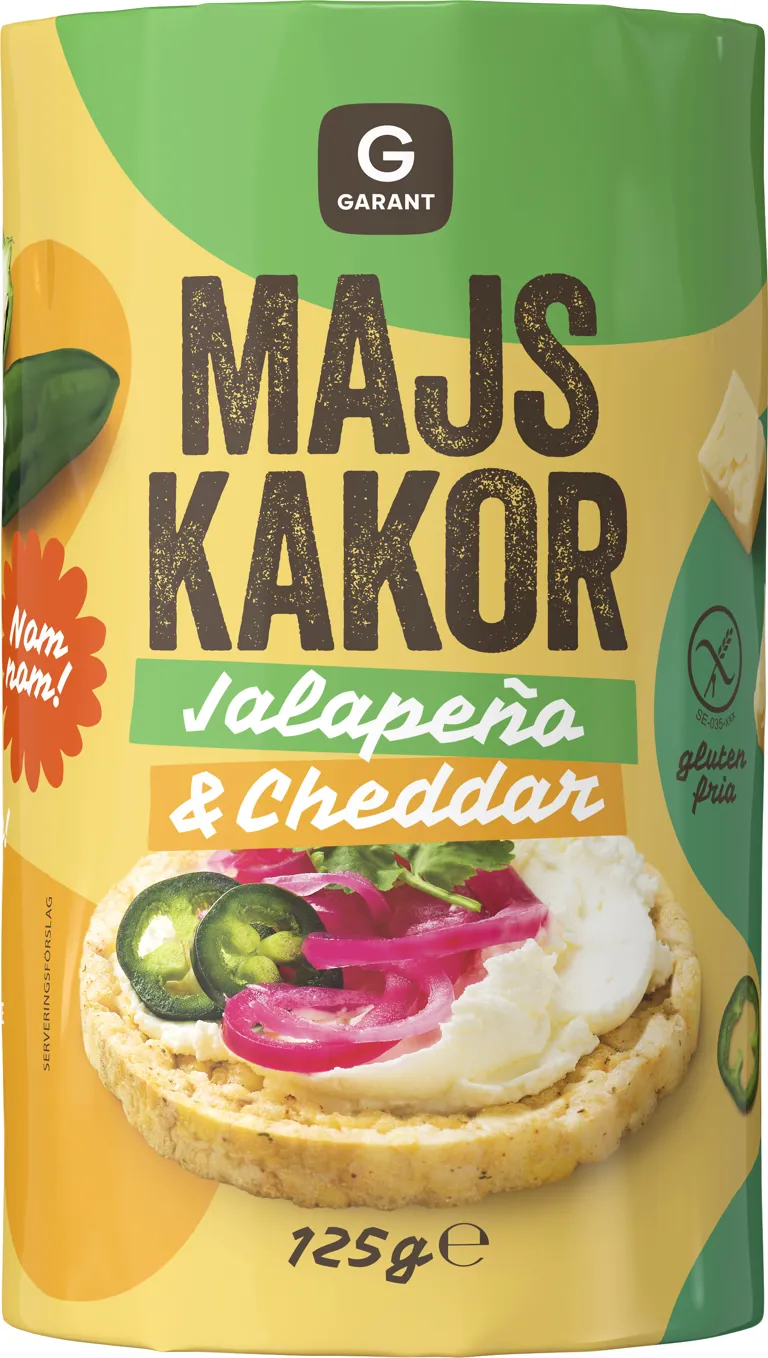 Majskakor med smak av Jalapeno & Cheddar. Perfekt som mellanmål eller tilltugg. Glutenfria. 125 gram.