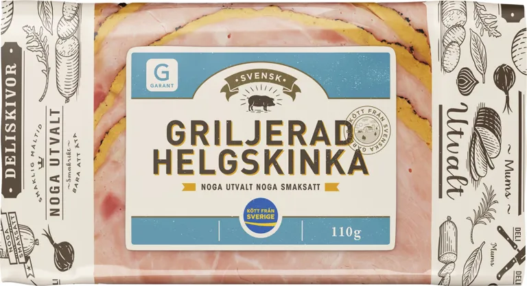 Griljerad och skivad helgskinka från Sverige. Garanterat gott som smörgåspålägg till frukost och mellanmål. Märket Kött från Sverige visar att köttet i produkten kommer från djur som är uppfödda i Sverige. Produkten är även förädlad och förpackad i Sverige.