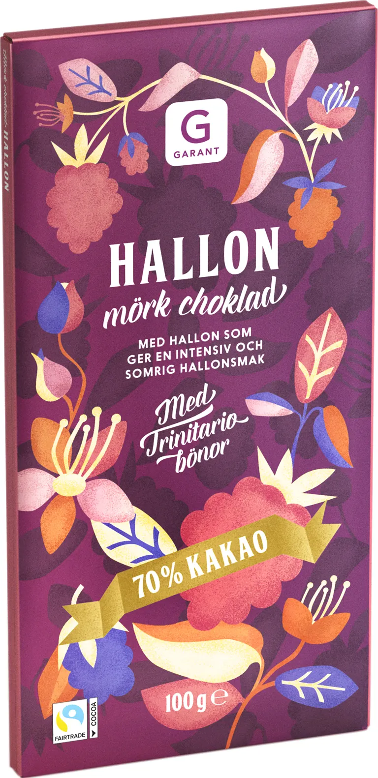 Mörk choklad 70% med smak av hallon. Med hallon som ger en intensiv och somrig hallonsmak. 100 gram.