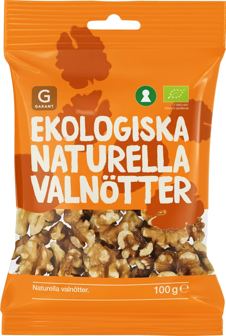 Ekologiska VALNÖTTER. Kan innehålla spår av JORDNÖT, MANDEL, HASSELNÖT, CASHEWNÖT, PEKANNÖT, PARANÖT, PISTASCHNÖT och MACADAMIANÖT.