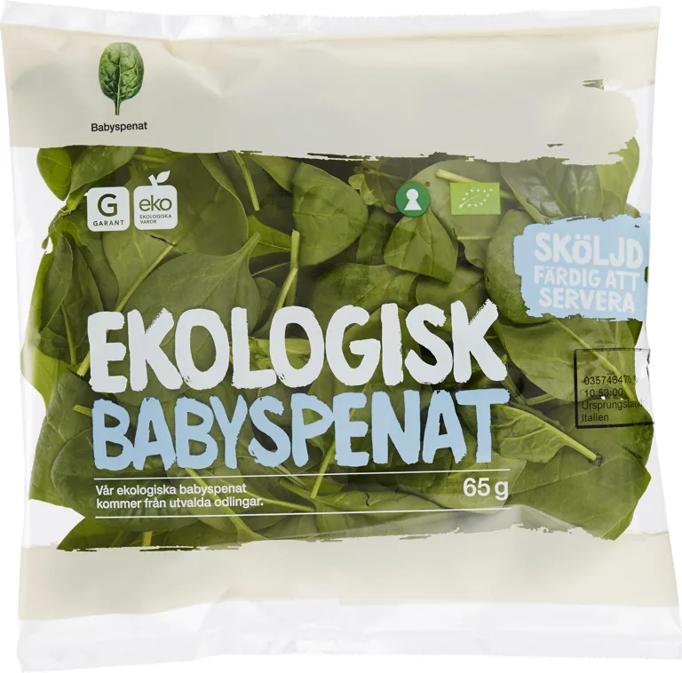 Ekologiskt odlad småbladsspenat som är färdigsköljd, och bör därmed inte sköljas innan servering. 65 gram.