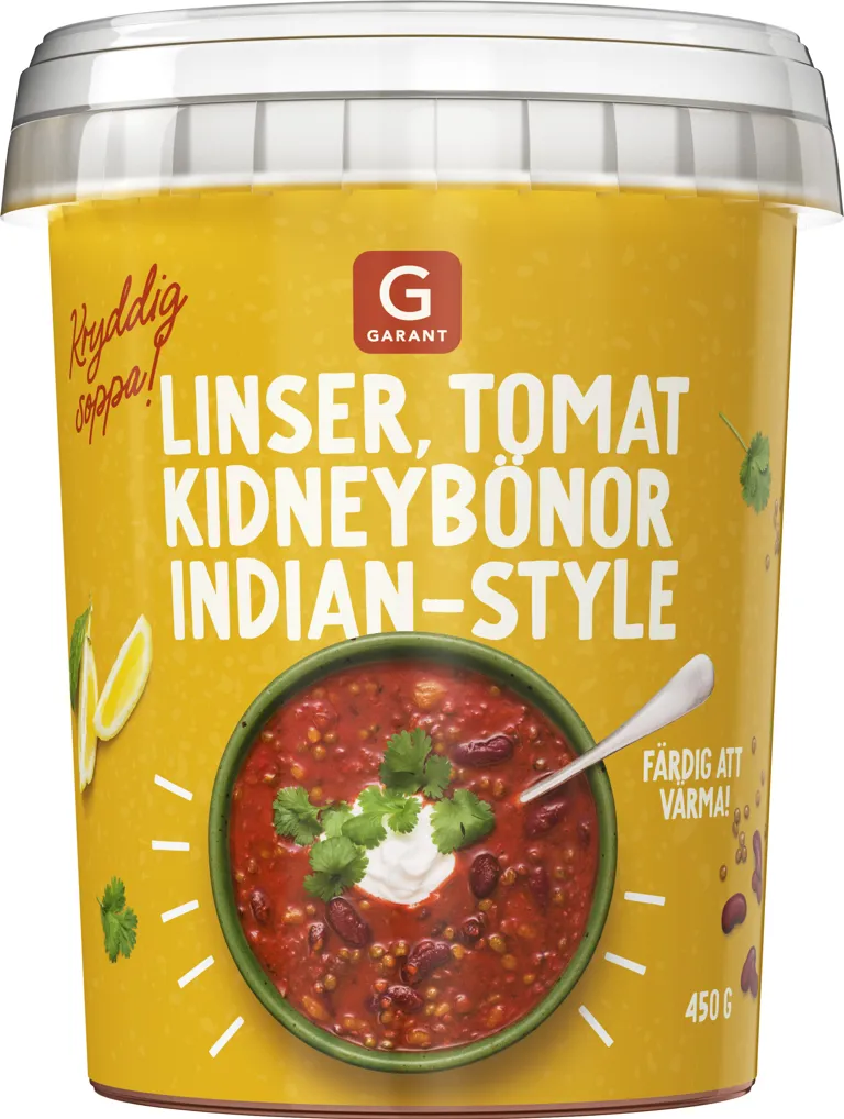 Kryddig soppa med linser, tomat och kidneybönor. "Indian-style". Färdig att värma! 450 gram.