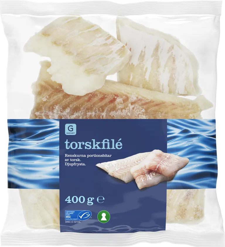 Djupfryst torskfilé. Renskurna portionsbitar av torsk. 400 gram.