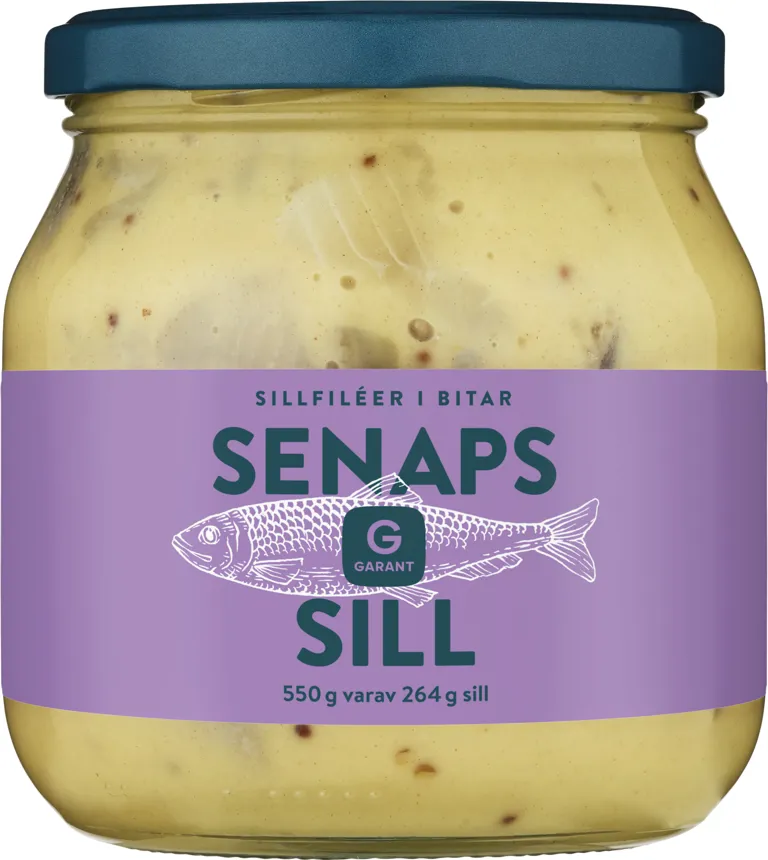Marinerad SILL (Clupea harengus)* i bitar 48% (salt, ättika, socker), senap 15% (vatten, socker, SENAPSFRÖ, ättika, salt, färgämne (E101, karotener)), vatten, socker, rapsolja, brunt SENAPSFRÖ, förtjockningsmedel (E415), konserveringsmedel (E211), färgämne (karotener). *Fiskad med ringnot/trål i Nordostatlanten.