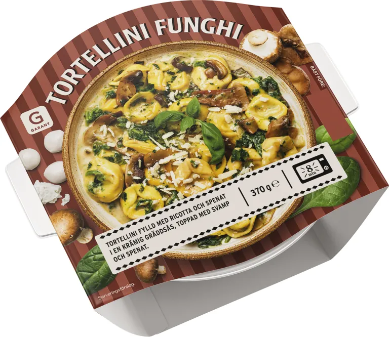 Djupfryst tortellini fylld med ricotta och spenat i en krämig gräddsås, toppad med svamp och spenat. 370 gram.