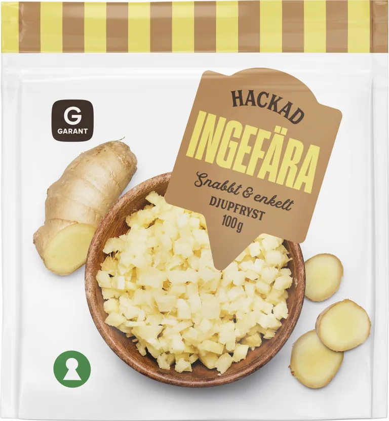Djupfryst hackad ingefära. Används som färsk ingefära i matlagning. Kan användas både färsk och tinad. 100 gram.