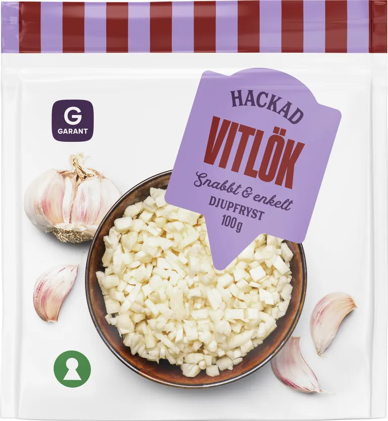 Djupfryst hackad vitlök. Används i matlagning precis som färsk vitlök. 100 gram.