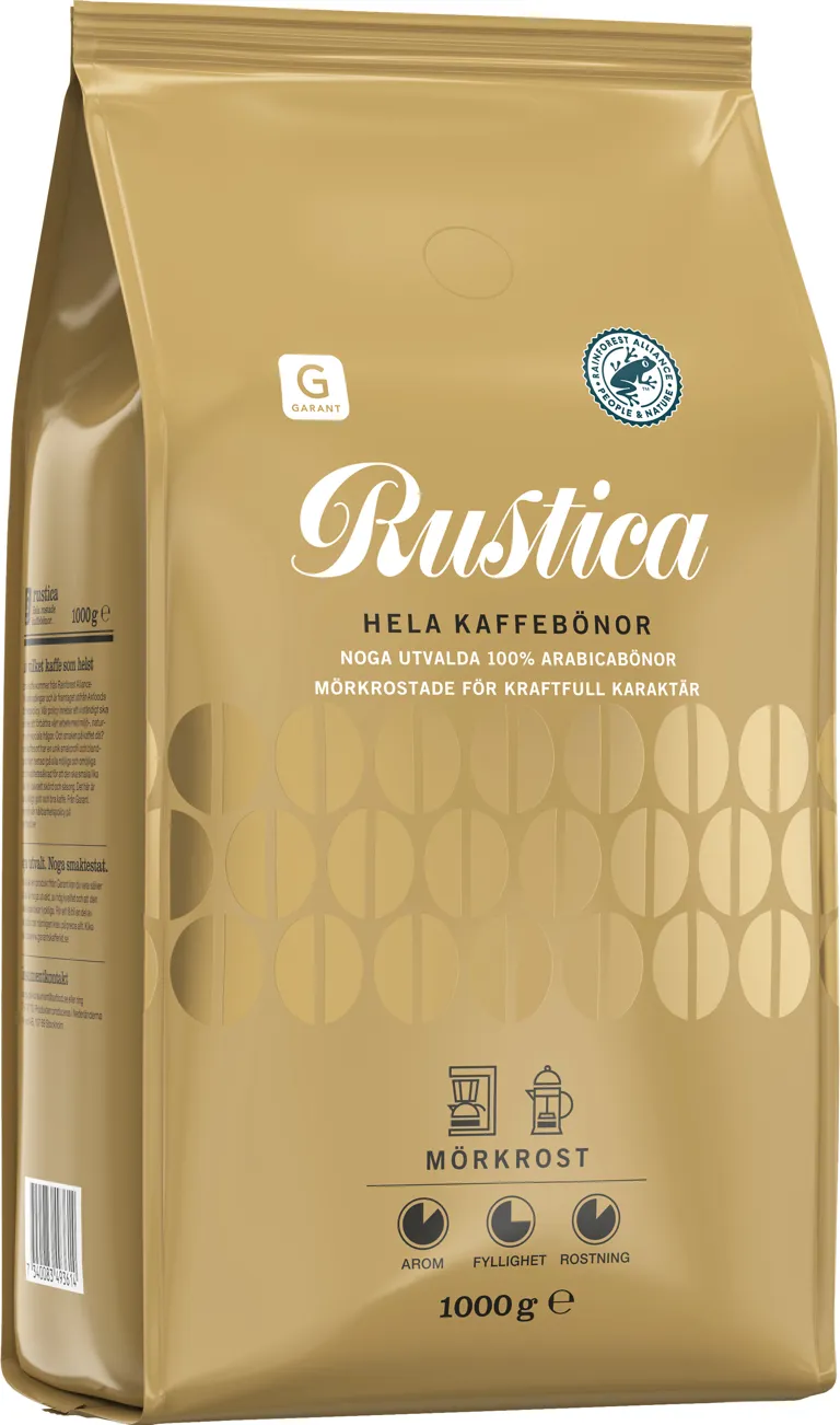 Hela kaffebönor Rustica med noga utvalda och mörkrostade arabicabönor för en kraftfull karaktär. Kaffebönorna har en unik smakprofil och blandningen är noga testad och kvalitetssäkrad för att den ska smaka lika bra året om, oavsett skörd och säsong. Garants kaffebönor kommer från Rainforest Alliance-certifierade odlingar som jobbar för att bevara ekosystem, vattenresurser, djurliv och rättigheter för arbetare samt deras familjer och samhällen.