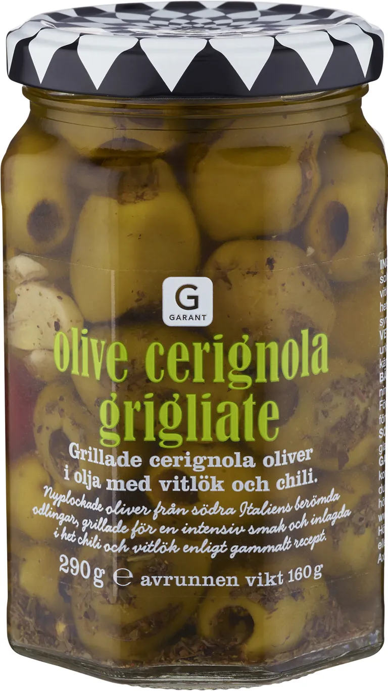 Olive cerignola grigliate. Grillade cerignola oliver i olja med vitlök och chili. Nyplockade oliver från Italien samt grillade för en intensiv smak. 290 gram, avrunnen vikt 160 gran.