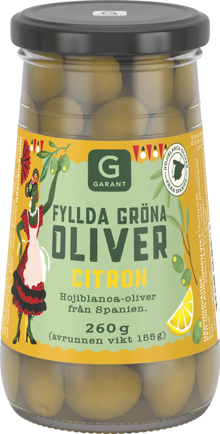 Gröna oliver fyllda med citron. 260 gram, avrunnen vikt 155 gram.