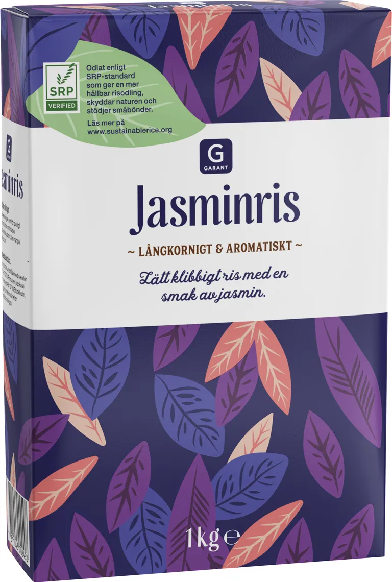 Långkornigt och aromatiskt jasminris, 1 kg. Jasminris är ett vitt och långkornigt ris med en doft och smak av jasmin. Riset har en lätt klibbig konsistens och passar utmärkt till asiatiska rätter. Jasminris är det traditionella tillbehöret till thailändska rätter, men förekommer också som ett baslivsmedel i hela Sydostasien.