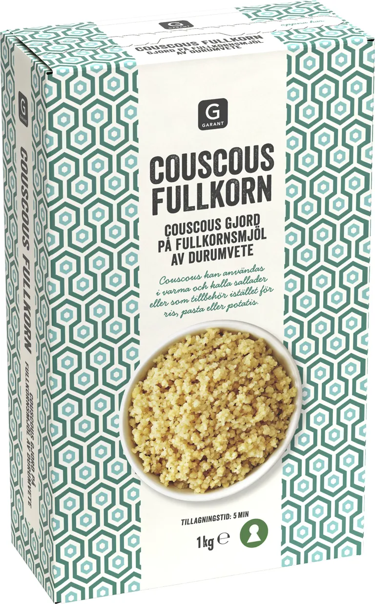 Couscous gjord på fullkornsmjöl av durumvete. Kan användas i varma och kalla sallader eller som tillbehör istället för ris, pasta eller potatis. 1 kg.