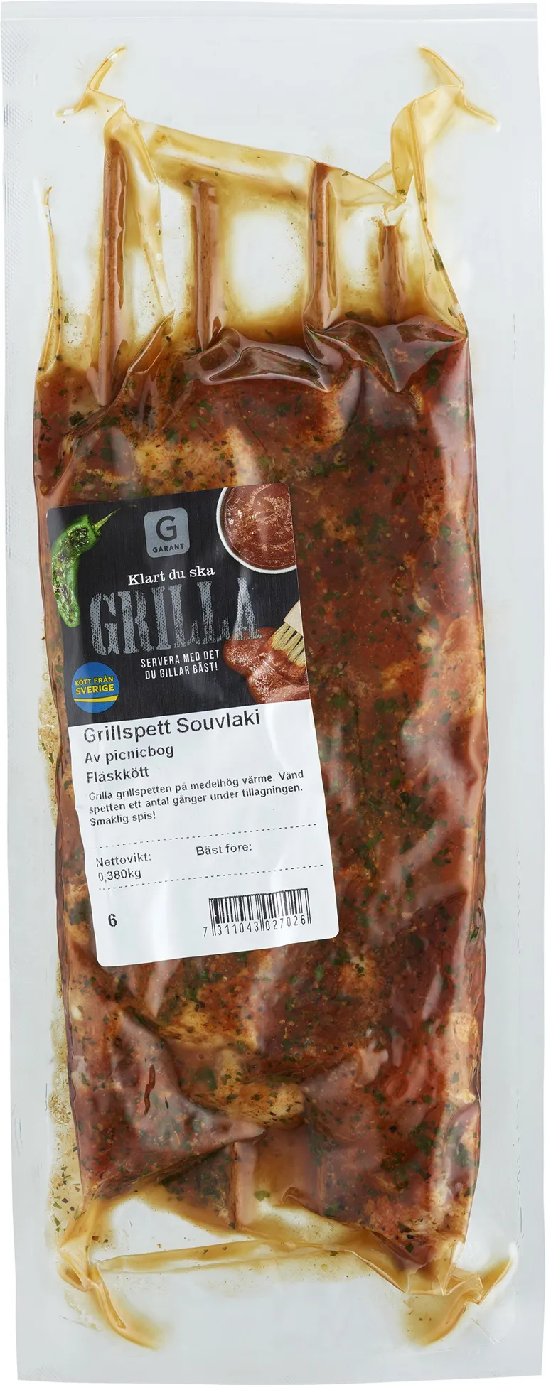 Grillspett souvlaki gjorda på fläskkött från Sverige, närmare bestämt skuren picnicbog. Kryddade med vitlök, paprikapulver, oregano, persilja, cayennepeppar, salt, svartpeppar och en skvätt citronjuice. Klara att lägga direkt på grillen eller tillaga i stekpannan. 380 gram.