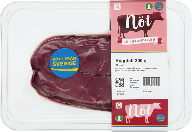 Skivad ryggbiff från svenska gårdar. I ny förpackning vilket ger ett mörare kött med längre hållbarhet och mindre mängd plast. 300 gram.