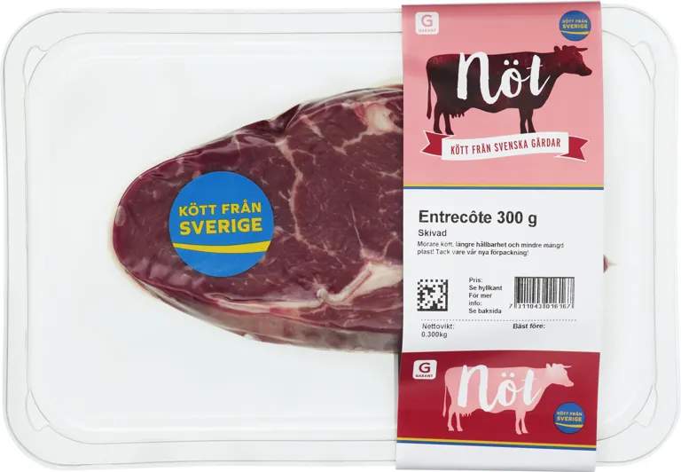 Skivad entrecôte från svenska gårdar. I ny förpackning vilket ger ett mörare kött med längre hållbarhet och mindre mängd plast. 300 gram.