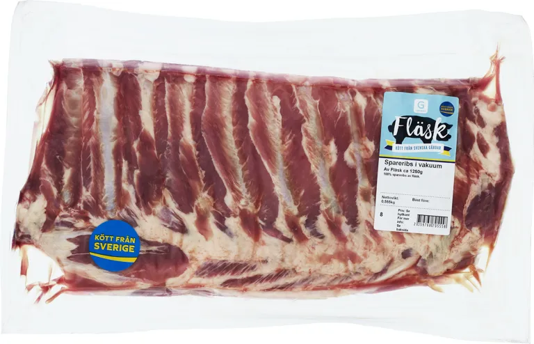 Spareribs av fläsk i vakuum. Kött från svenska gårdar. 1,25kg.